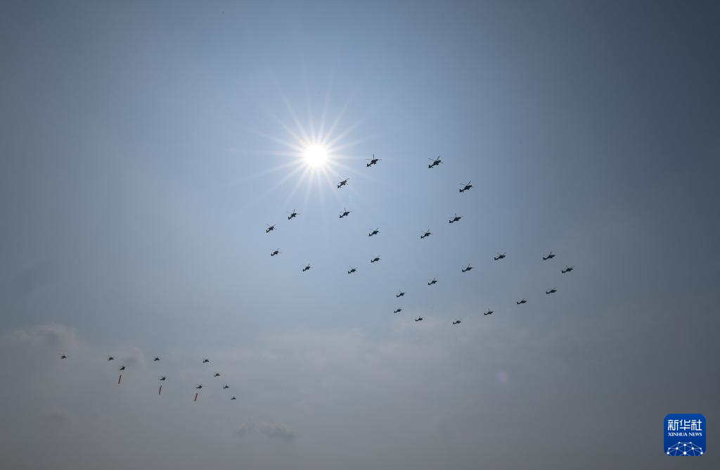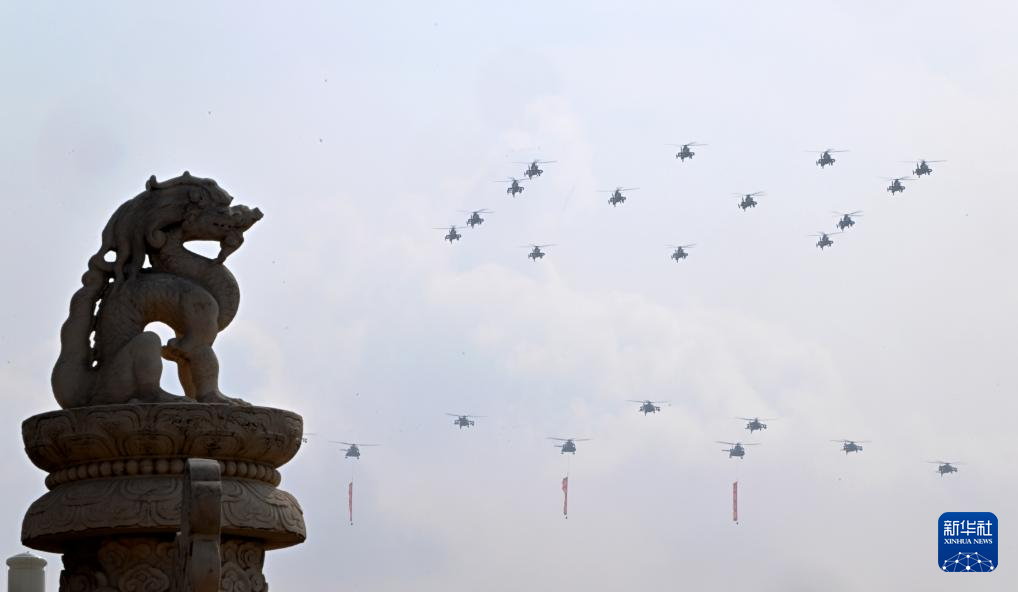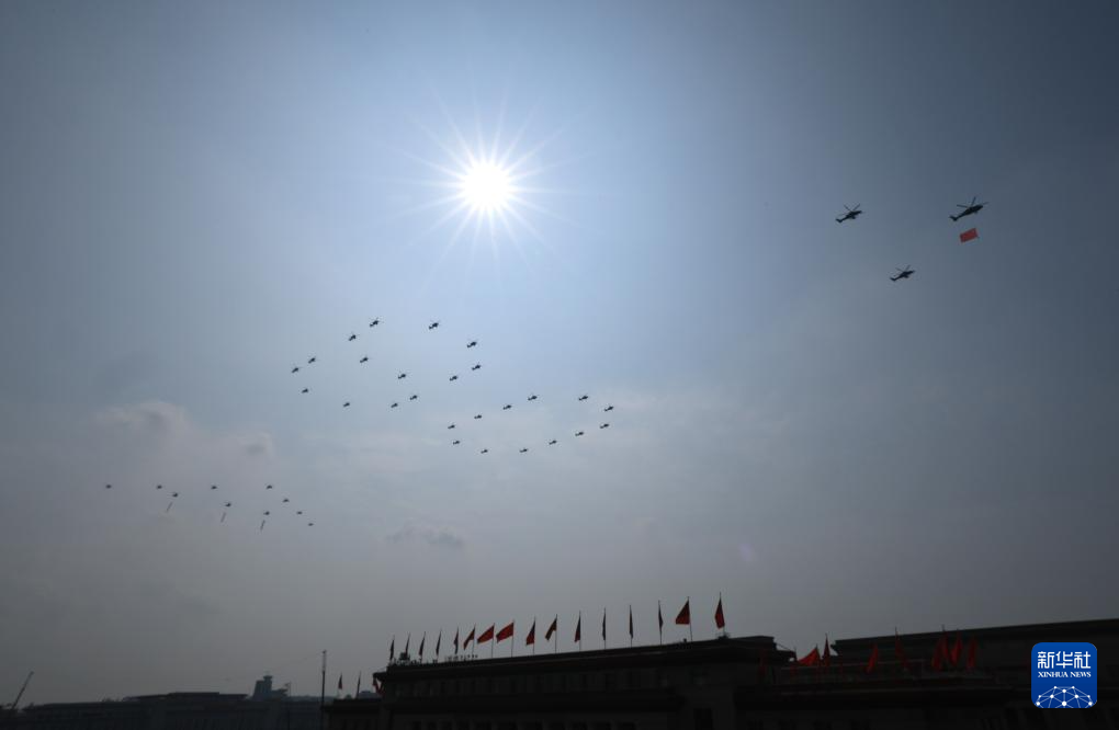 9月3日,紀念中國人民抗日戰爭暨世界反法西斯戰爭勝利80周年大會在北京隆重舉行。這是空中護旗梯隊通過天安門廣場。