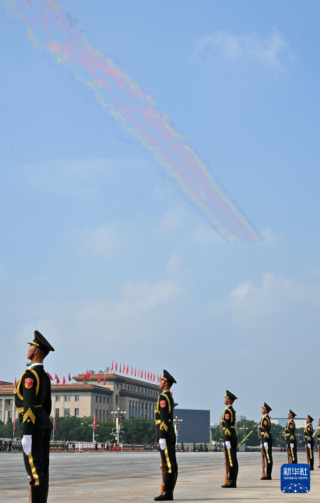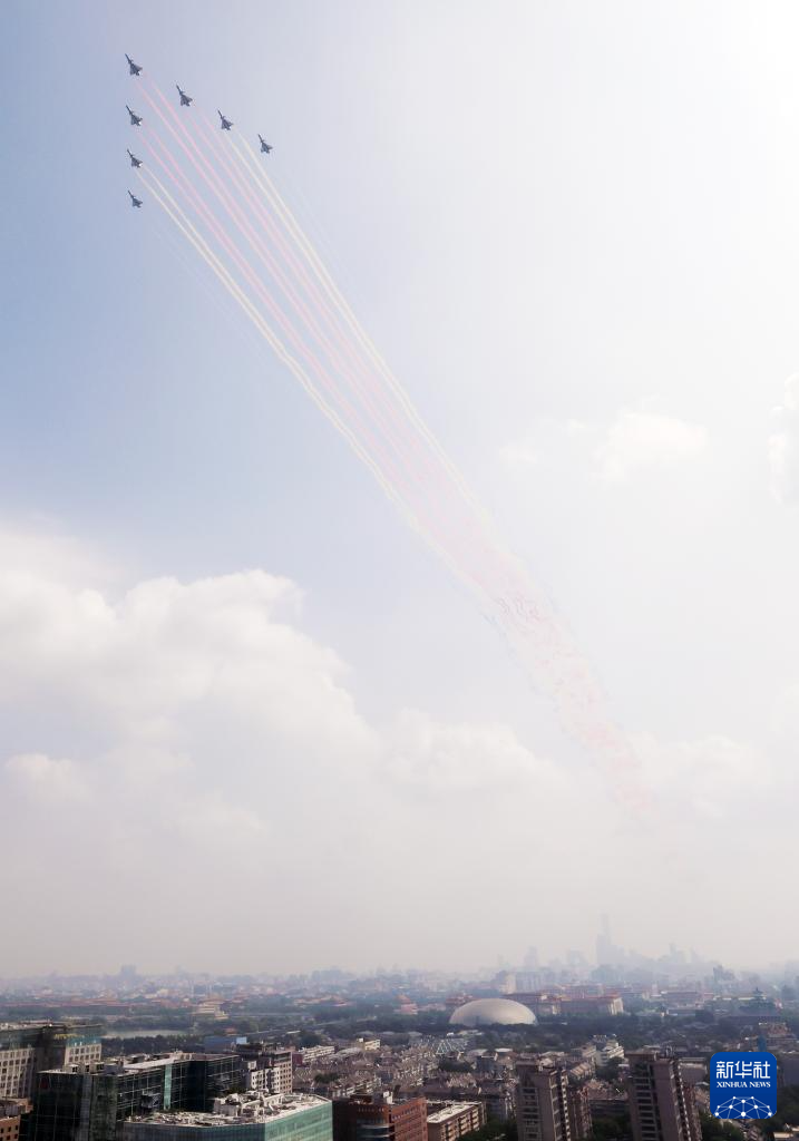 9月3日,紀念中國人民抗日戰爭暨世界反法西斯戰爭勝利80周年大會在北京隆重舉行。這是空中護旗梯隊飛過天安門廣場上空。