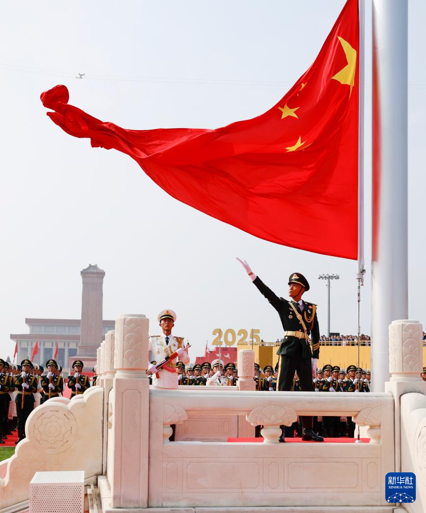 9月3日,紀念中國人民抗日戰爭暨世界反法西斯戰爭勝利80周年大會在北京隆重舉行。這是天安門廣場舉行隆重的升國旗儀式。