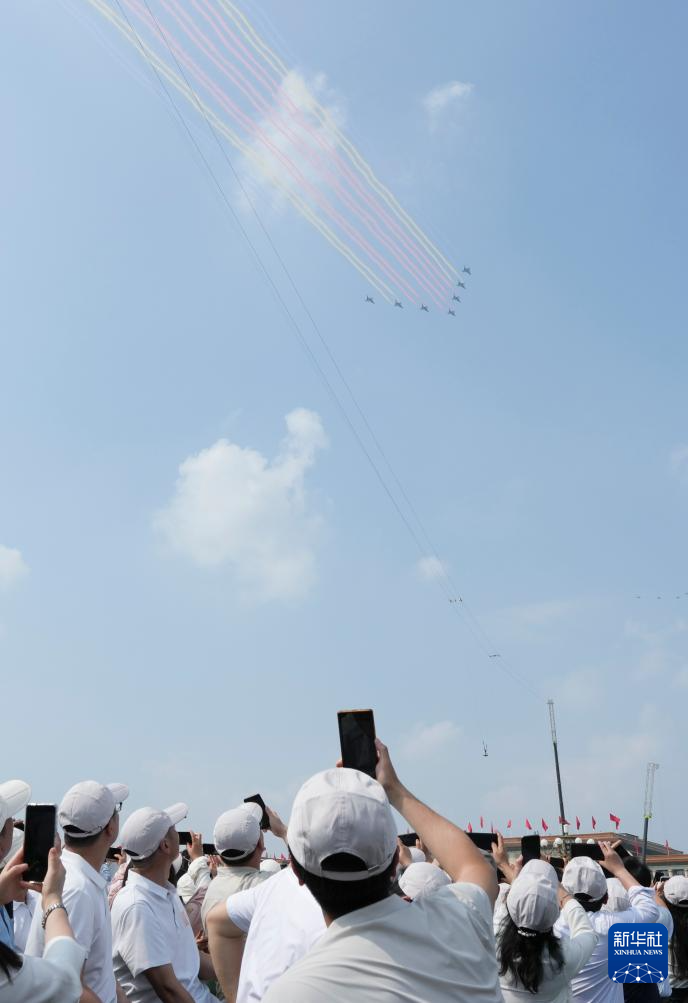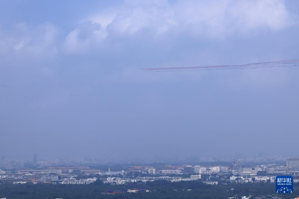 9月3日,紀念中國人民抗日戰爭暨世界反法西斯戰爭勝利80周年大會在北京隆重舉行。這是教練機梯隊飛過天安門廣場上空。