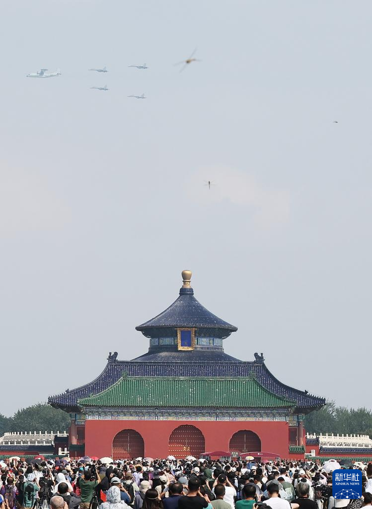 9月3日,紀念中國人民抗日戰爭暨世界反法西斯戰爭勝利80周年大會在北京隆重舉行。這是市民在北京天壇公園觀看空中護旗梯隊。
