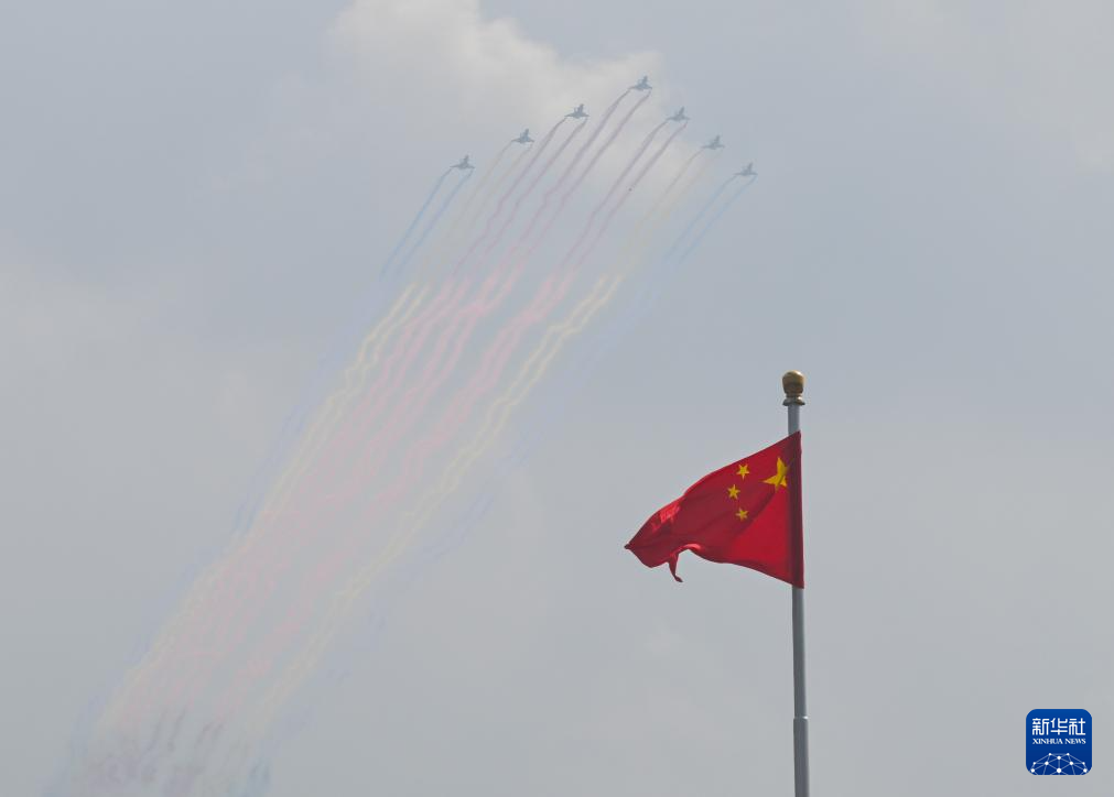 9月3日,紀念中國人民抗日戰爭暨世界反法西斯戰爭勝利80周年大會在北京隆重舉行。這是教練機梯隊飛過天安門廣場上空。