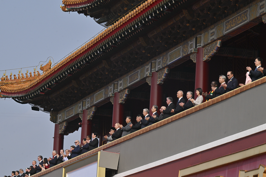 9月3日,紀念中國人民抗日戰爭暨世界反法西斯戰爭勝利80周年大會在北京天安門廣場隆重舉行。這是大會開始前,中共中央總書記、國家主席、中央軍委主席習近平同出席大會的外方代表團團長前往天安門城樓。