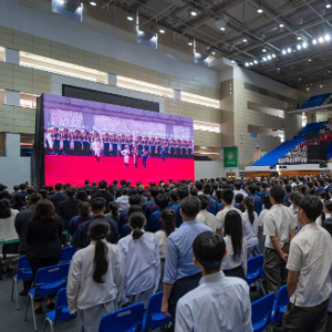 9月3日,澳門社會各界在澳門理工大學體育館觀看紀念中國人民抗日戰爭暨世界反法西斯戰爭勝利80周年大會直播。
