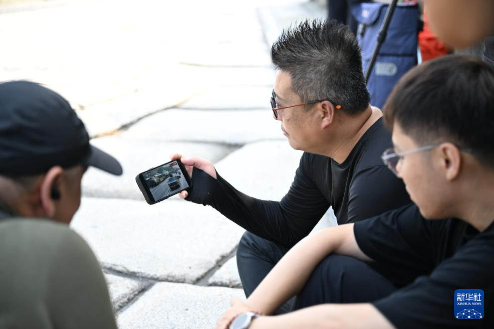 9月3日,市民游客在北京盧溝橋景區通過手機觀看大會直播。