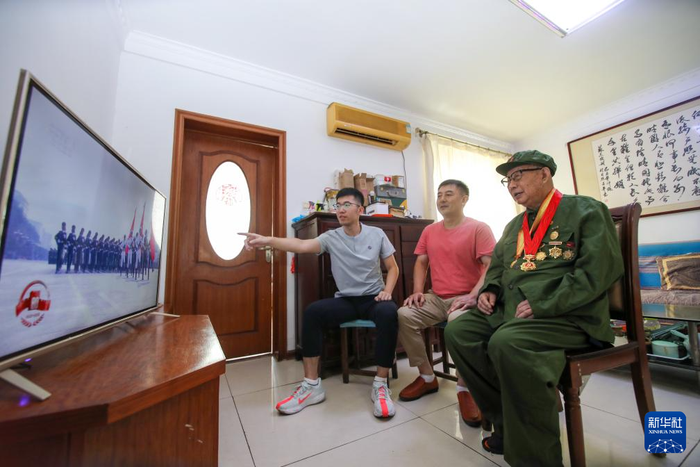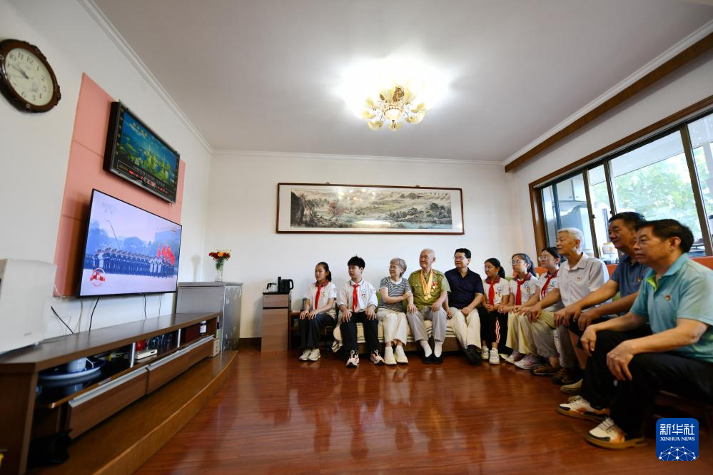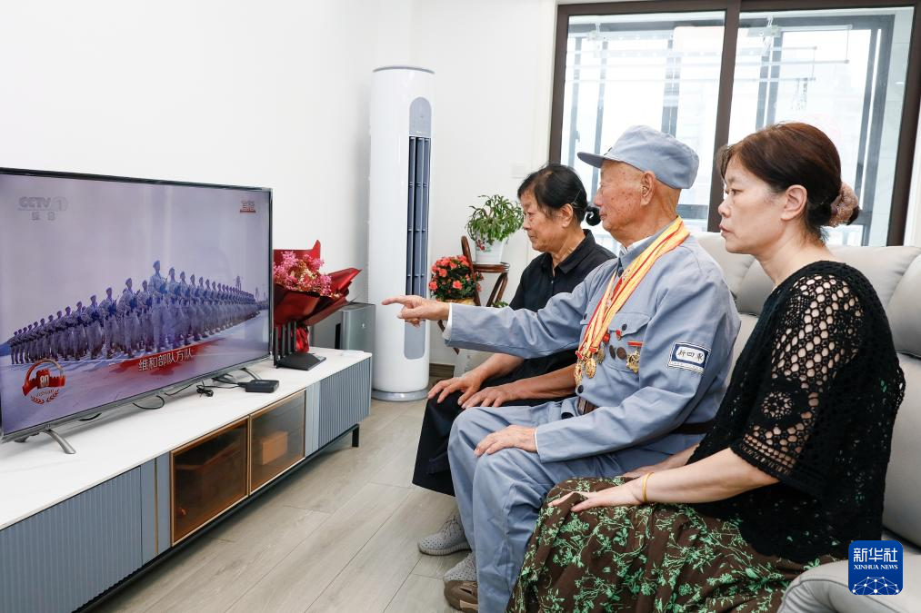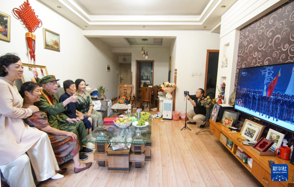 9月3日,江蘇海安抗戰老兵王承堅和家人一起收看紀念中國人民抗日戰爭暨世界反法西斯戰爭勝利80周年大會直播。