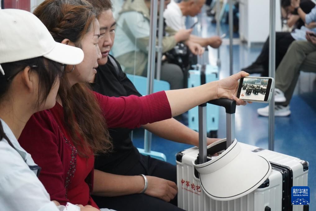 9月3日,在陜西省西安市地鐵1號線車廂,乘客通過手機觀看紀念中國人民抗日戰爭暨世界反法西斯戰爭勝利80周年大會直播。