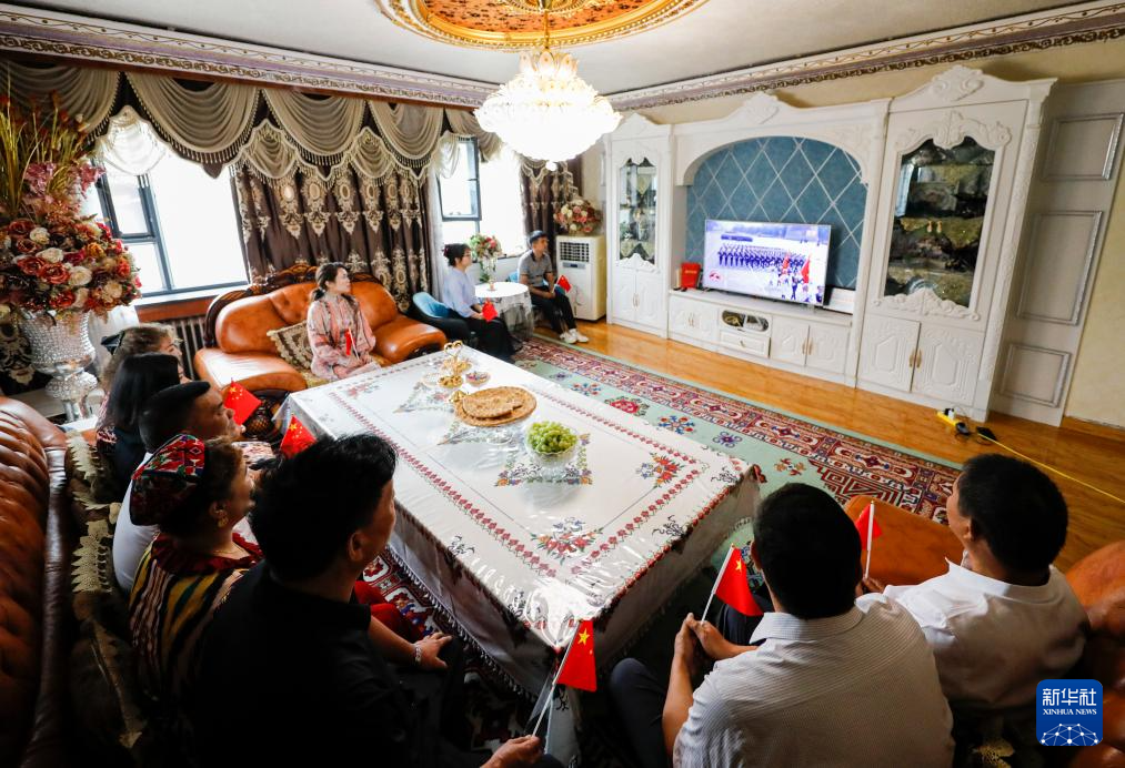 9月3日,在新疆尉犁縣興平鎮達西村,村民在家中觀看紀念中國人民抗日戰爭暨世界反法西斯戰爭勝利80周年大會直播。
