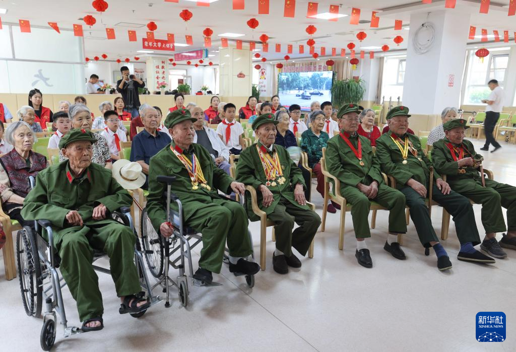 9月3日,在位于山東省臨沂市沂南縣大莊鎮的“山東抗戰老兵照護中心”,老兵們和志愿者、少先隊員一起觀看紀念中國人民抗日戰爭暨世界反法西斯戰爭勝利80周年大會直播。