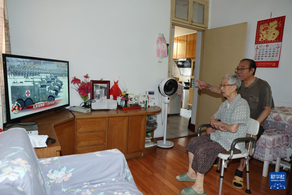 9月3日,南京大屠殺幸存者經智珍老人(前)和其長子何敏翔在南京家中觀看紀念中國人民抗日戰爭暨世界反法西斯戰爭勝利80周年大會直播。