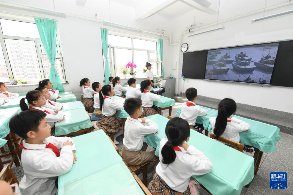 9月3日,哈爾濱市楊靖宇紅軍小學師生在觀看紀念中國人民抗日戰爭暨世界反法西斯戰爭勝利80周年大會直播。