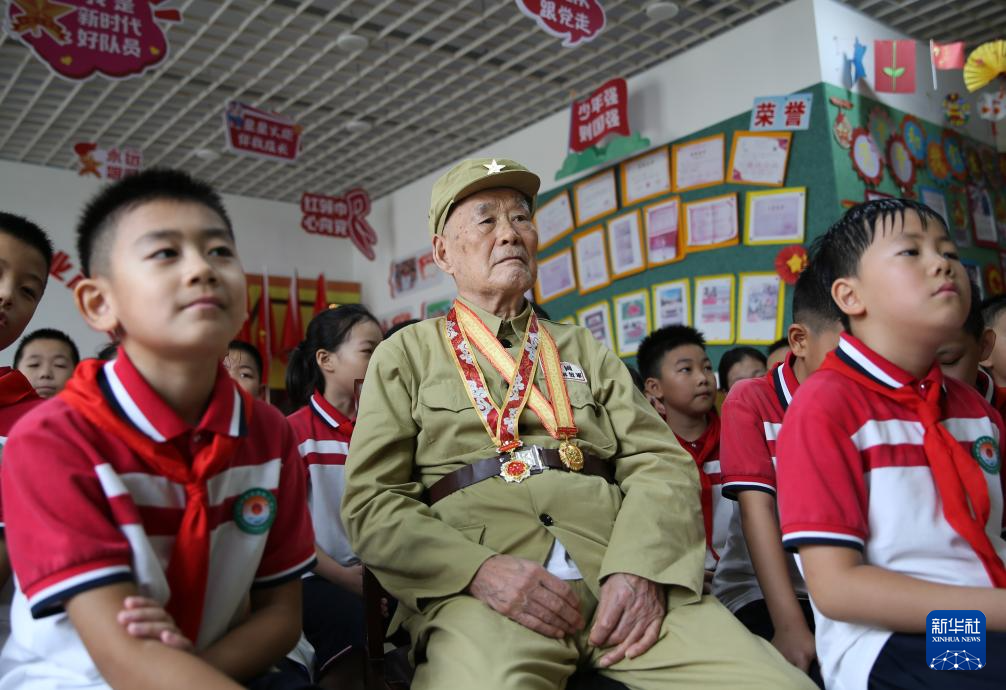9月3日,在山東省臨沂市郯城縣東方紅小學,抗戰老戰士王開昌與小學生們一起觀看紀念中國人民抗日戰爭暨世界反法西斯戰爭勝利80周年大會直播。