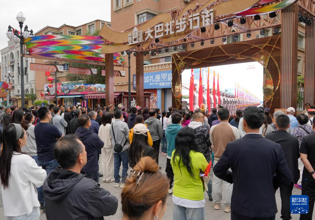 9月3日,在烏魯木齊大巴扎步行街,居民和游客一起觀看紀念中國人民抗日戰爭暨世界反法西斯戰爭勝利80周年大會直播。