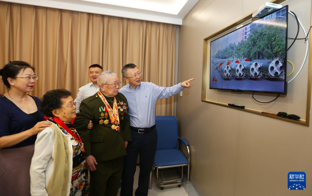 9月3日,在四川成都,96歲的八路軍老戰士許家海(右二)在家人的陪伴下觀看紀念中國人民抗日戰爭暨世界反法西斯戰爭勝利80周年大會直播。