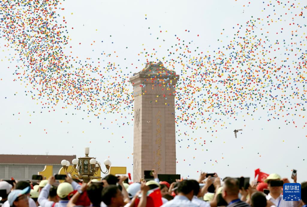 9月3日,紀念中國人民抗日戰爭暨世界反法西斯戰爭勝利80周年大會在北京隆重舉行。這是紀念大會現場放飛鴿子和氣球。