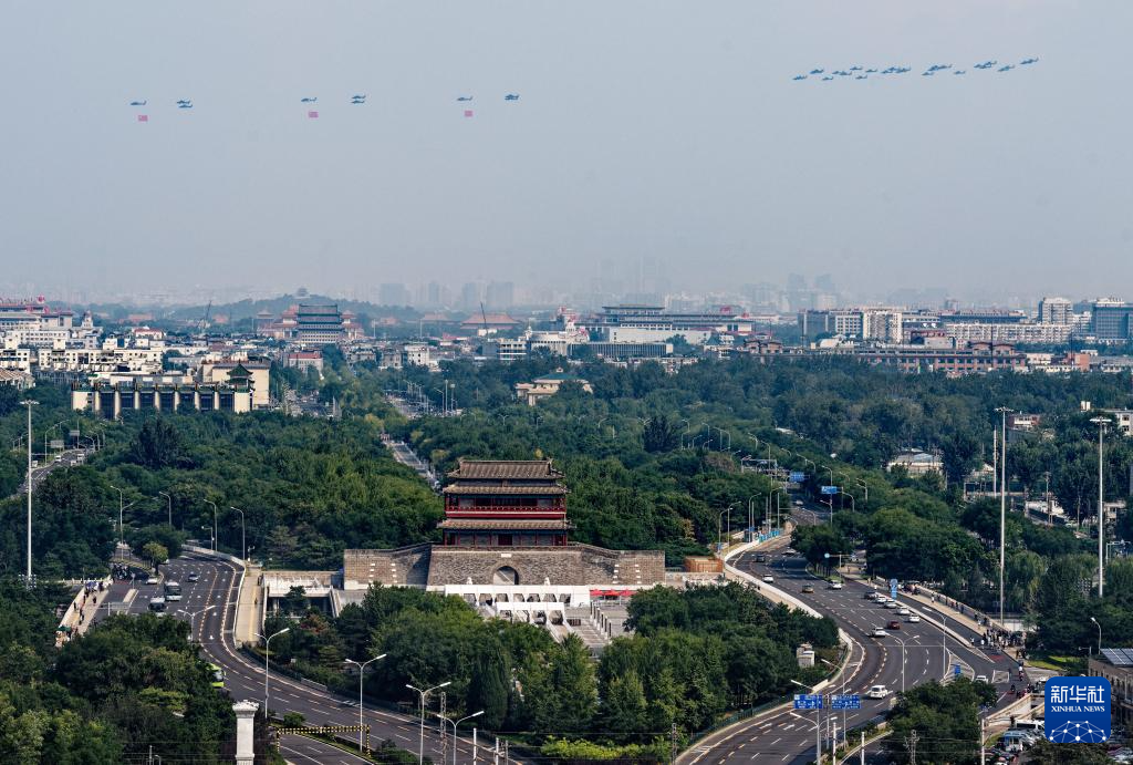 9月3日,紀念中國人民抗日戰爭暨世界反法西斯戰爭勝利80周年大會在北京隆重舉行。這是空中護旗梯隊通過天安門廣場。