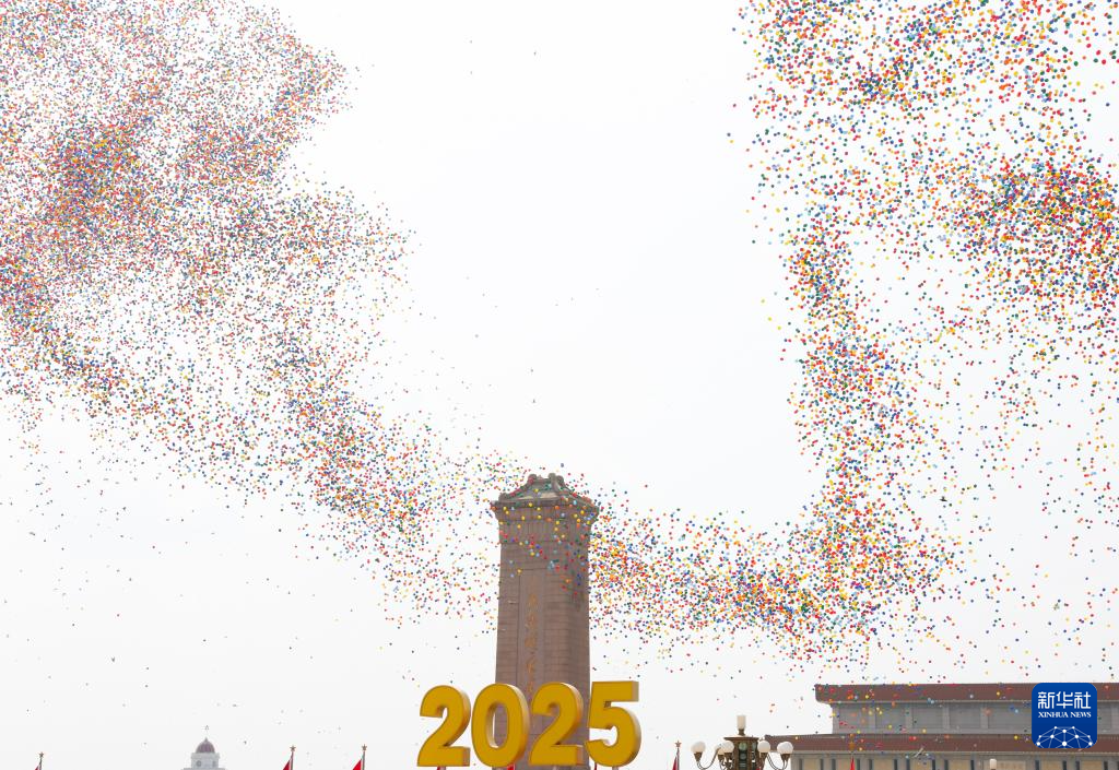 9月3日,紀念中國人民抗日戰爭暨世界反法西斯戰爭勝利80周年大會在北京隆重舉行。這是紀念大會現場放飛氣球。