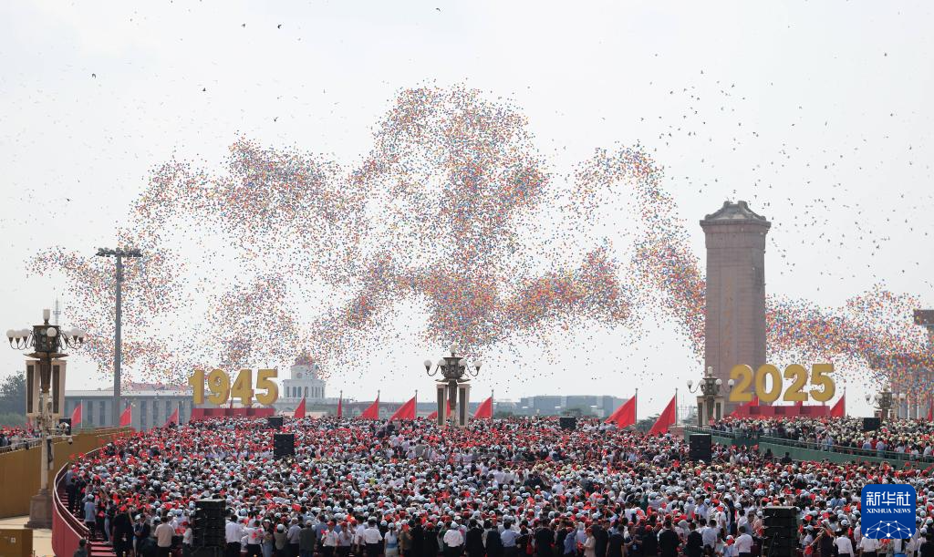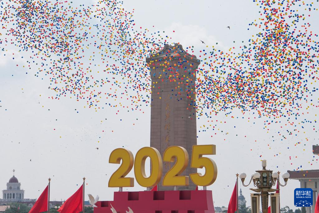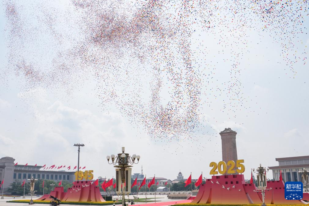 9月3日,紀念中國人民抗日戰爭暨世界反法西斯戰爭勝利80周年大會在北京隆重舉行。這是紀念大會現場放飛氣球。