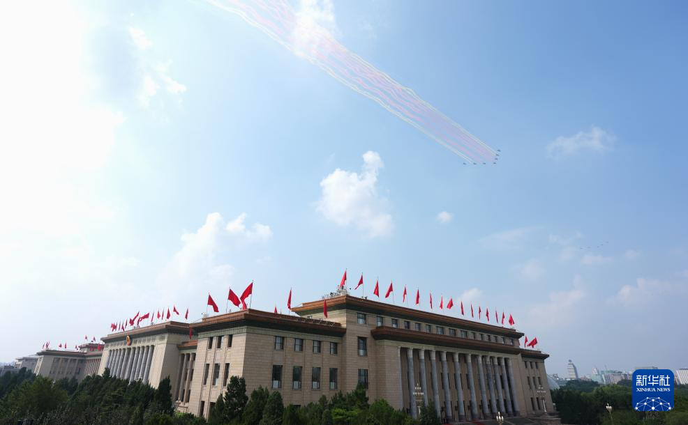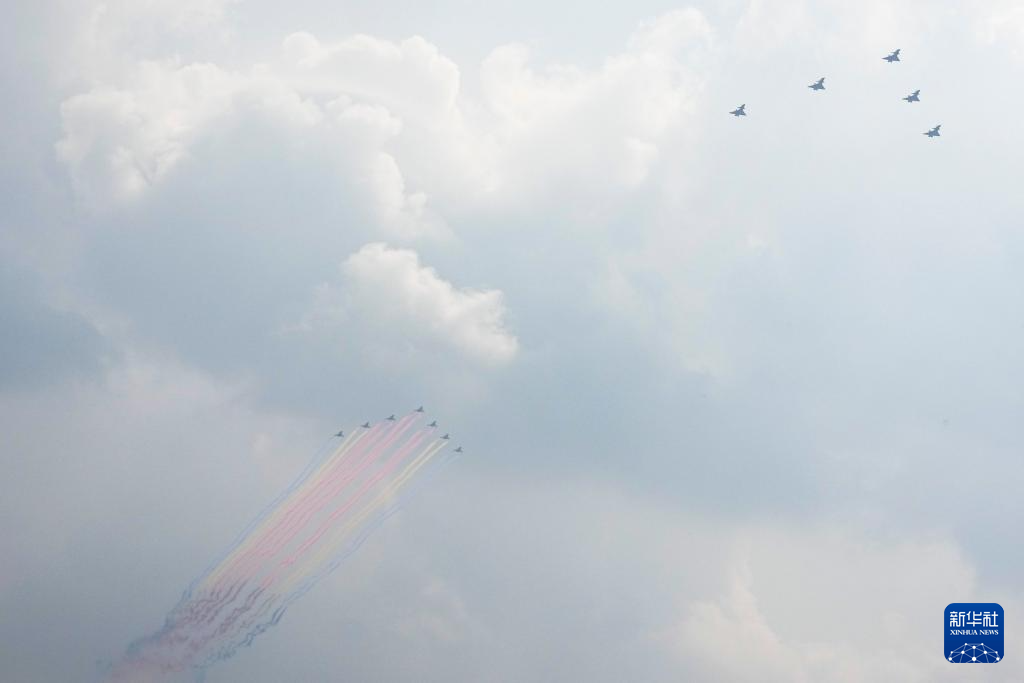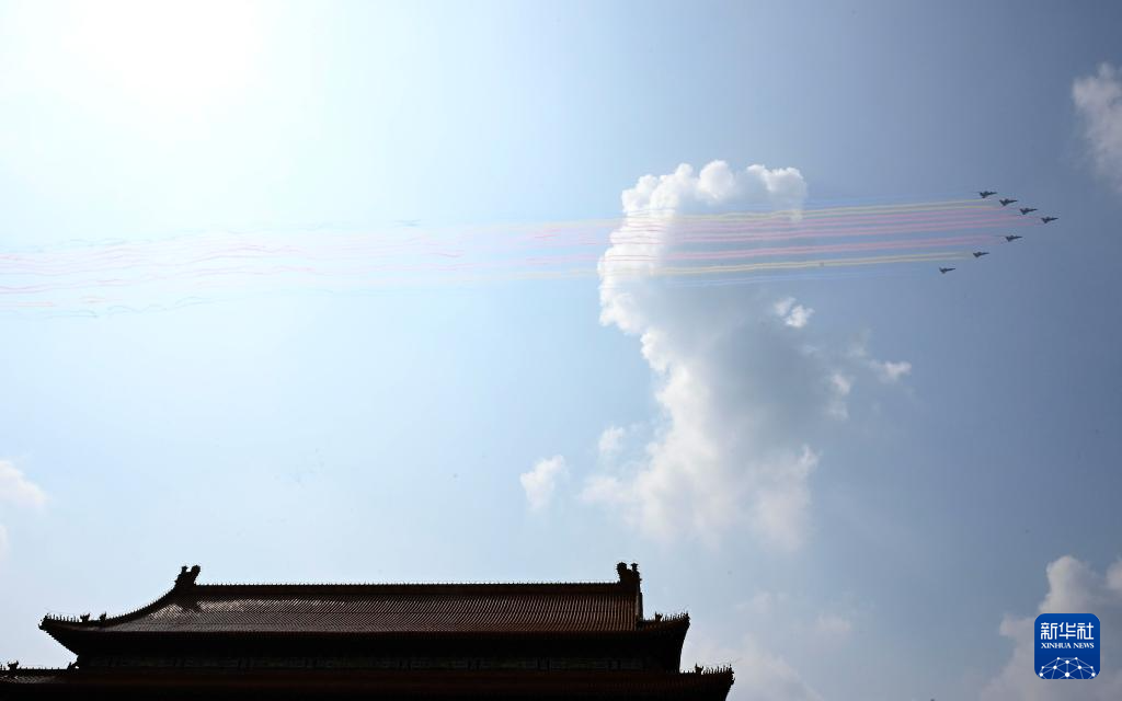 9月3日,紀念中國人民抗日戰爭暨世界反法西斯戰爭勝利80周年大會在北京隆重舉行。這是教練機梯隊飛過天安門廣場上空。