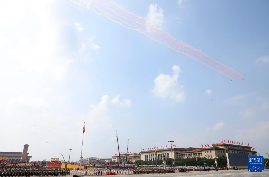 9月3日,紀念中國人民抗日戰爭暨世界反法西斯戰爭勝利80周年大會在北京隆重舉行。這是教練機梯隊飛過天安門廣場上空。