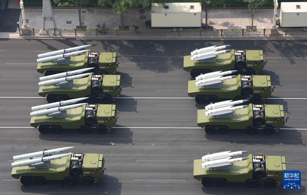9月3日,紀念中國人民抗日戰爭暨世界反法西斯戰爭勝利80周年大會在北京隆重舉行。這是反艦導彈方隊接受檢閱。
