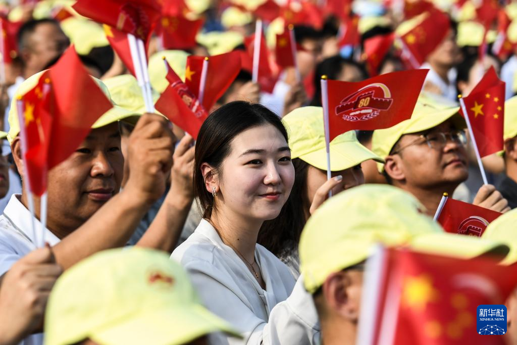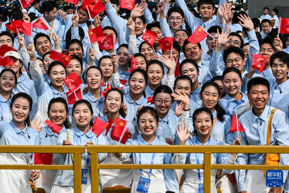 9月3日,紀念中國人民抗日戰爭暨世界反法西斯戰爭勝利80周年大會在北京隆重舉行。這是觀眾揮舞手中的旗幟。