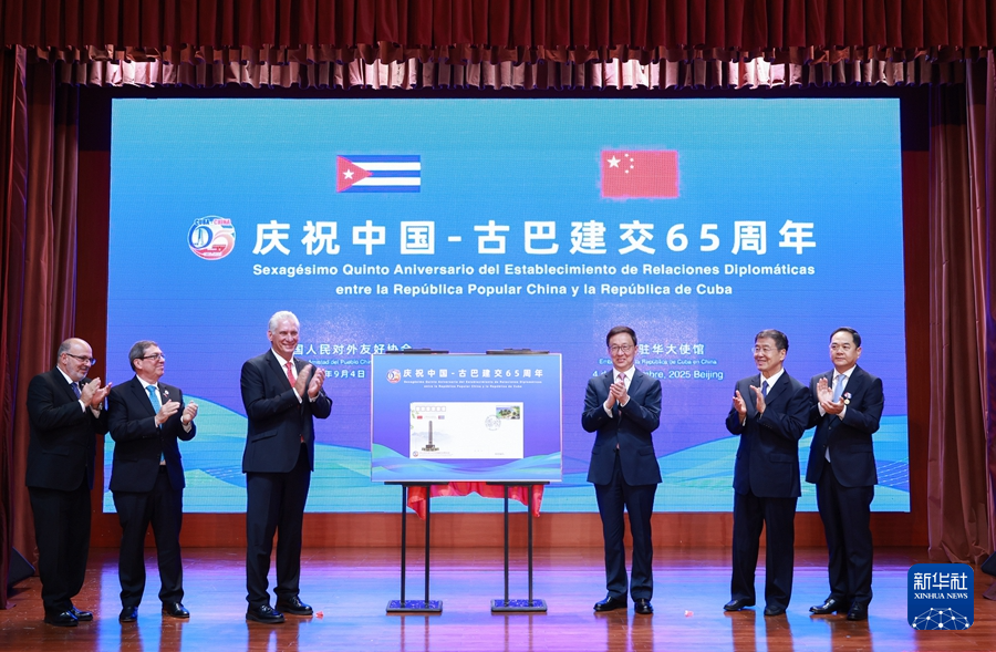 9月4日,國家副主席韓正在北京同古巴國家主席迪亞斯-卡內爾共同出席慶祝中古建交65周年友好交流活動并致辭。這是韓正同迪亞斯-卡內爾為中古建交65周年紀念封揭幕。