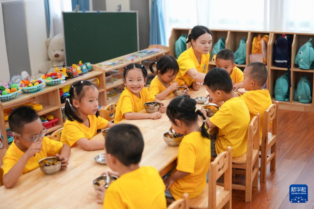 9月5日,四川瀘州白酒產業園區天驕托育園的老師照顧孩子們吃午飯。