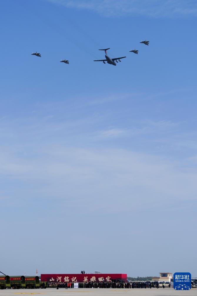 9月12日,第十二批在韓中國人民志愿軍烈士遺骸回國。這是在沈陽桃仙國際機場,接運烈士遺骸回國的運-20專機在4架殲-20飛機伴飛護航下即將降落。