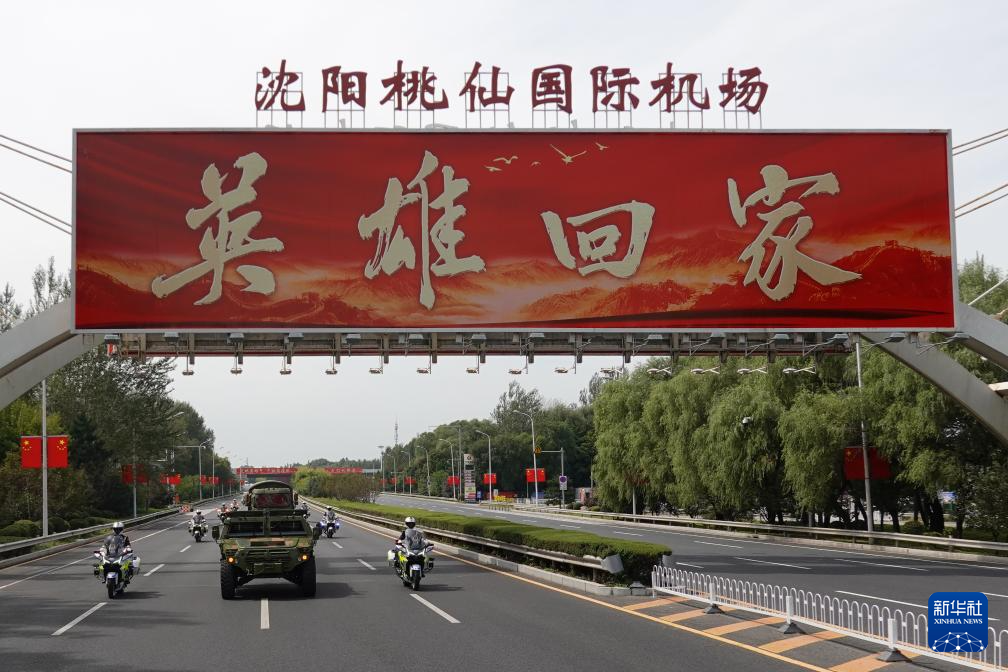 9月12日,第十二批在韓中國人民志愿軍烈士遺骸回國。這是運送志愿軍烈士遺骸的車隊經過沈陽街頭“英雄回家”標語牌。
