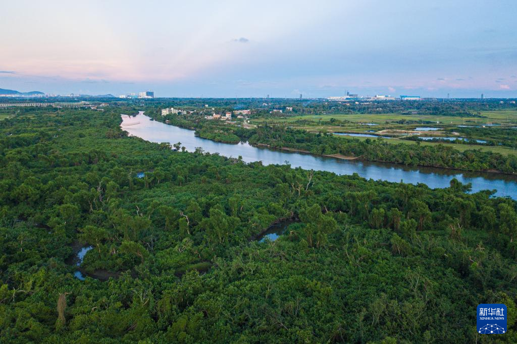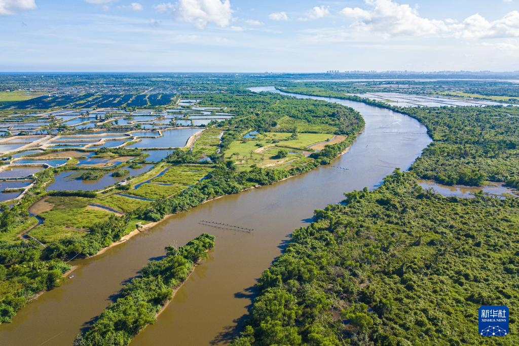 這是海南省文昌市文教鎮加美村毗鄰的文教河,河岸邊有連片的紅樹林(無人機照片,9月3日攝)。