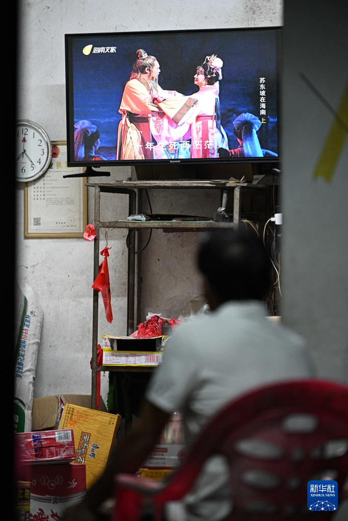 9月3日,村民在海南省文昌市文教鎮加美村一間小賣部里觀看瓊劇《蘇東坡在海南》。