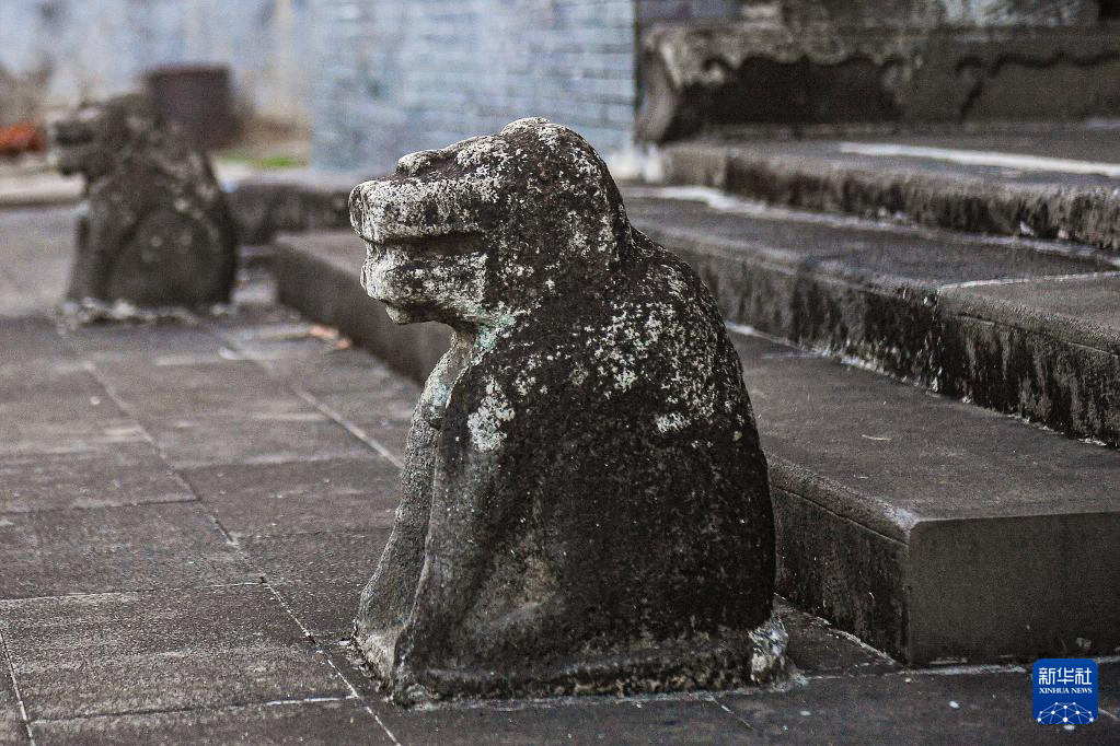 這是海南省文昌市文教鎮加美村邢宥故居門前的一對石獅(9月4日攝)。因年代久遠,石獅已大片斑駁。