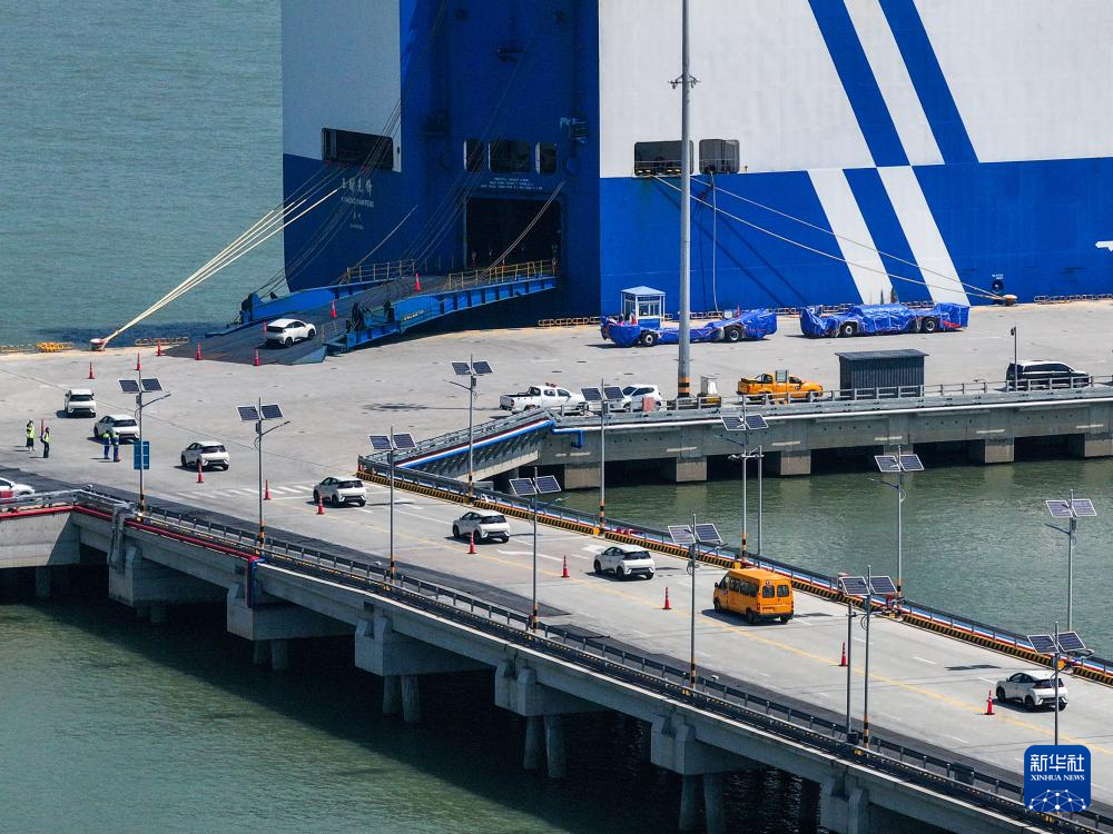 9月16日,在江蘇太倉港,國產汽車有序登船,裝載3600余輛商品車的“玉衡先鋒”號即將啟程前往東南亞(無人機照片)。