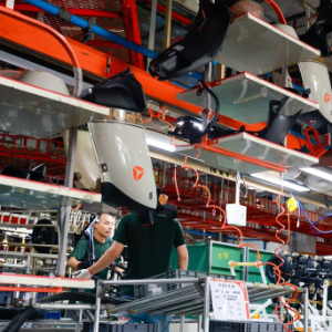 9月16日,工作人員在江蘇無錫錫山區電動車產業園雅迪科技集團的電動車生產線上進行翻轉車架作業。