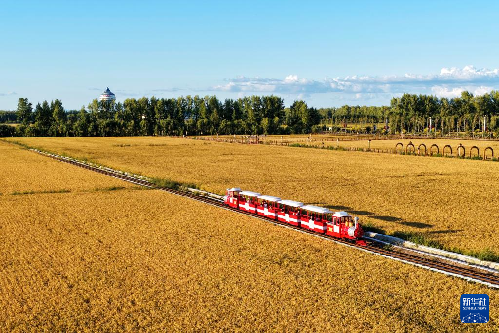 9月6日,在黑龍江省佳木斯市同江市,旅游小火車在稻田間行駛(無人機照片)。