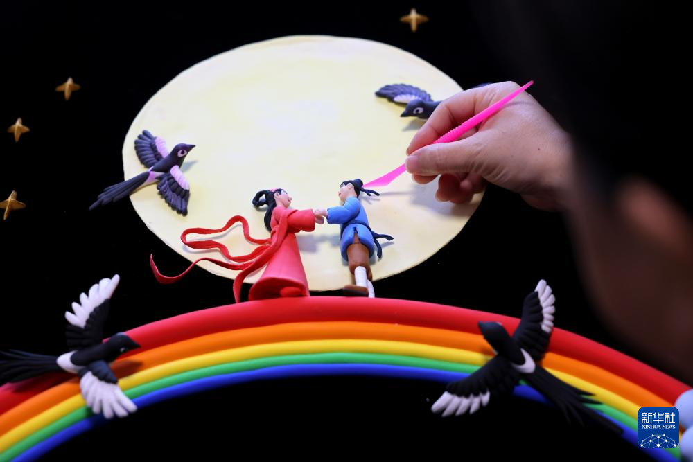 8月29日七夕節,在山東省棗莊市非物質文化遺產保護中心,民間藝人創作面塑作品《鵲橋會》。