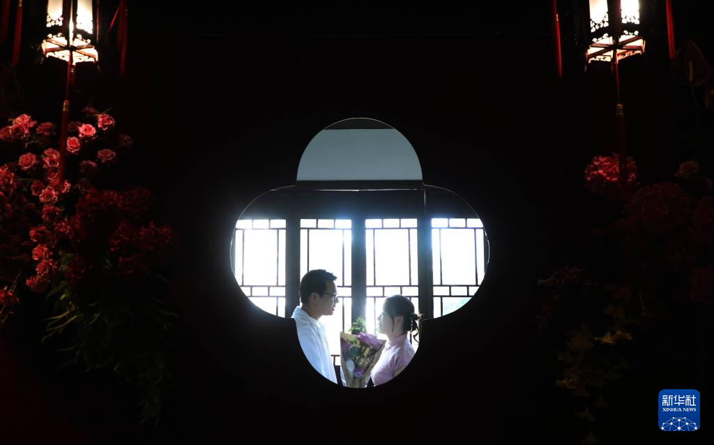 8月29日七夕節,一對新人在江蘇省蘇州市姑蘇區婚姻登記處耦園登記點拍照留念。