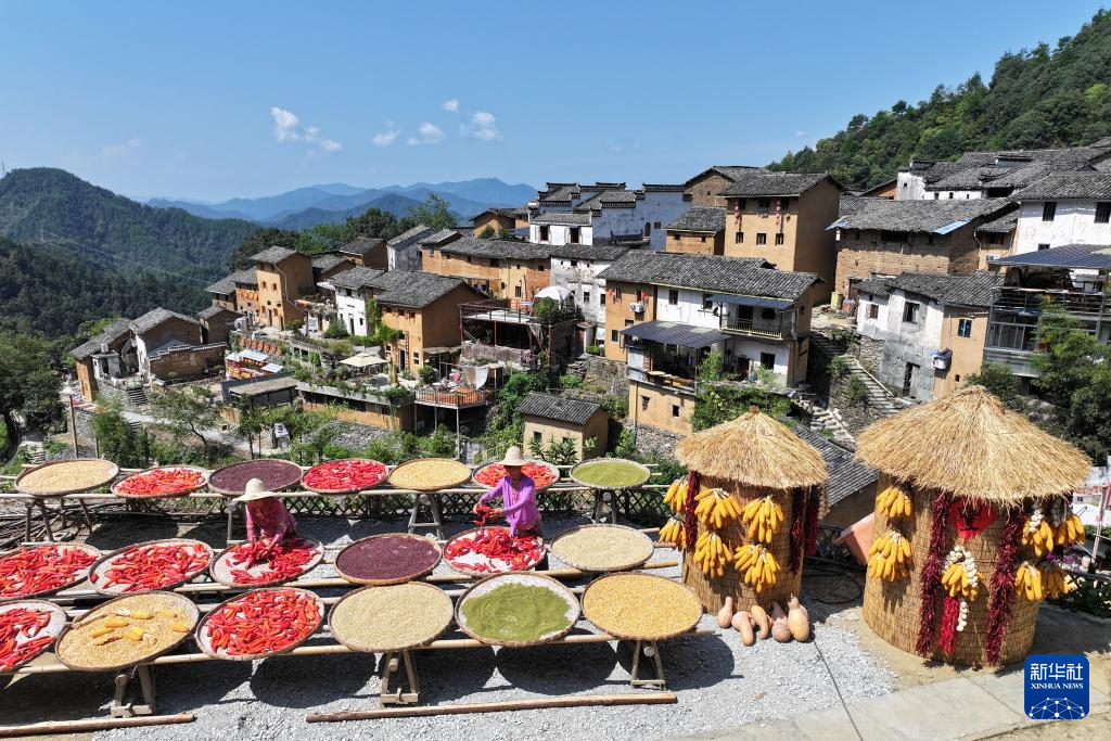 9月17日,在安徽省黃山市歙縣深渡鎮陽產村,農民趁晴好天氣晾曬收獲的農作物(無人機照片)。