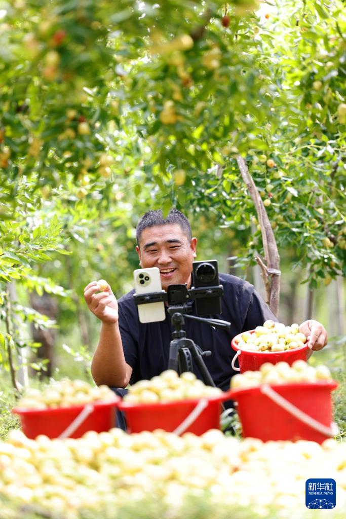 9月7日,在江蘇省宿遷市泗洪縣大樓街道面西社區的一處棗園,棗農通過網絡直播推介當地的奶油沙棗。