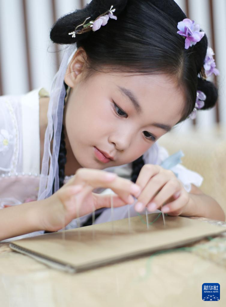 8月27日,在山東省鄒平市黃山街道,小朋友在七夕民俗活動中穿針。