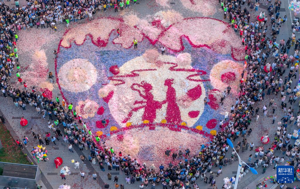 8月29日七夕節,人們在云南省昆明市晉寧區觀看用玫瑰花瓣鋪就的巨幅圖景《云間鵲橋·花雨鋪路》(無人機照片)。