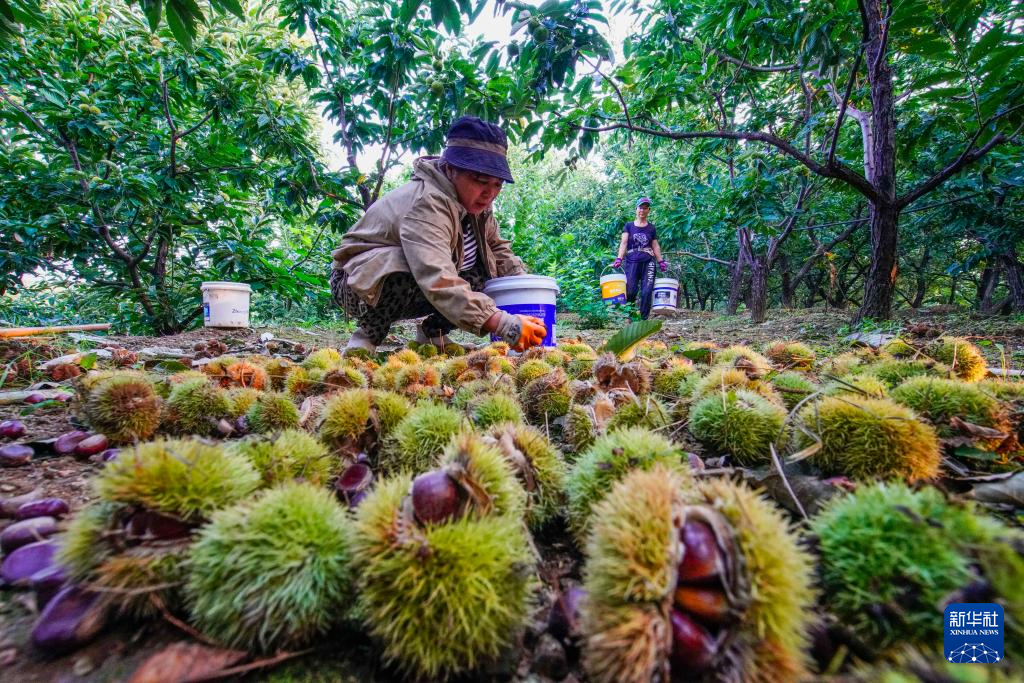 9月9日,河北省遵化市西三里鎮北峪村農民在收獲板栗。