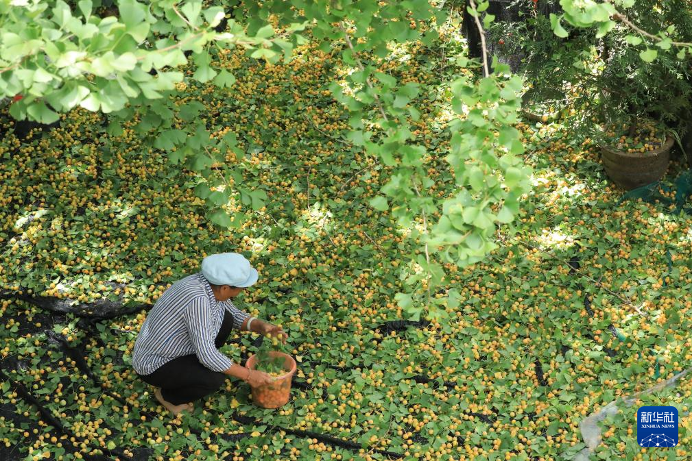 9月6日,農民在云南省騰沖市固東鎮江東村收獲落在地上的銀杏果實。