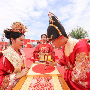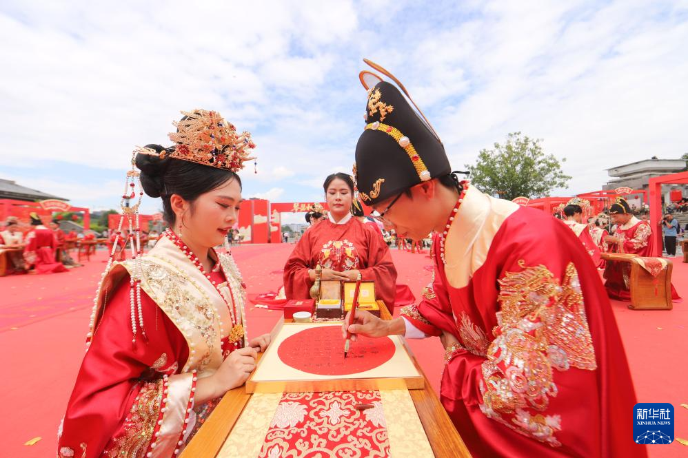 8月29日七夕節,在貴州省貴陽市花溪區貴陽孔學堂,新人在集體婚禮現場“共書婚貼”。