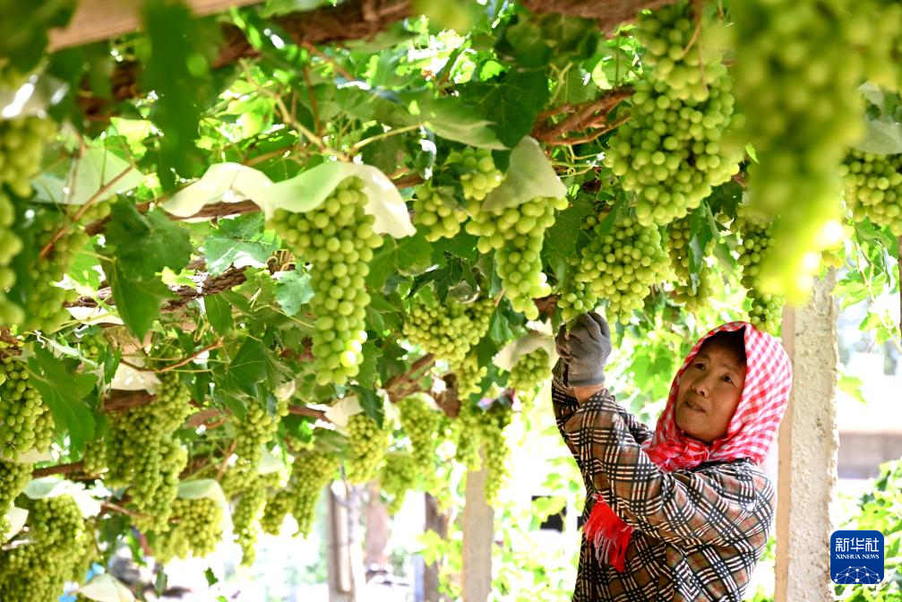 9月7日,甘肅省敦煌市陽關鎮營盤村農民在葡萄園中采摘葡萄。