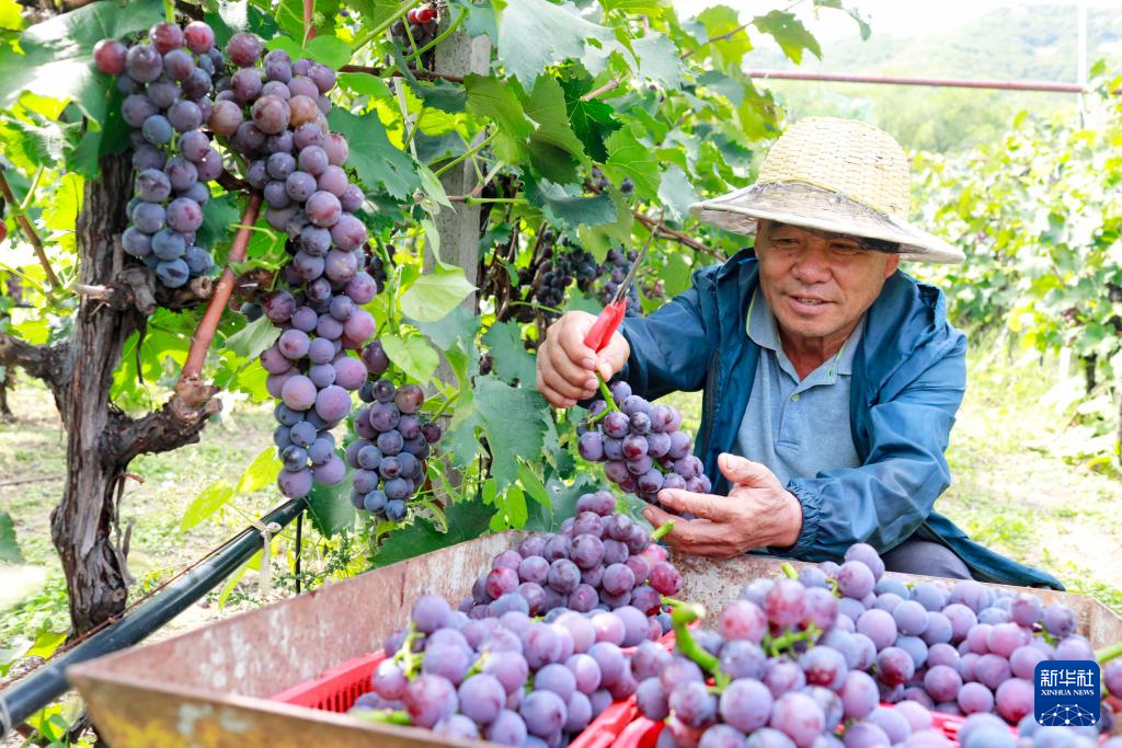 9月16日,在山東省威海市環翠區一處葡萄種植園,果農在采摘葡萄。