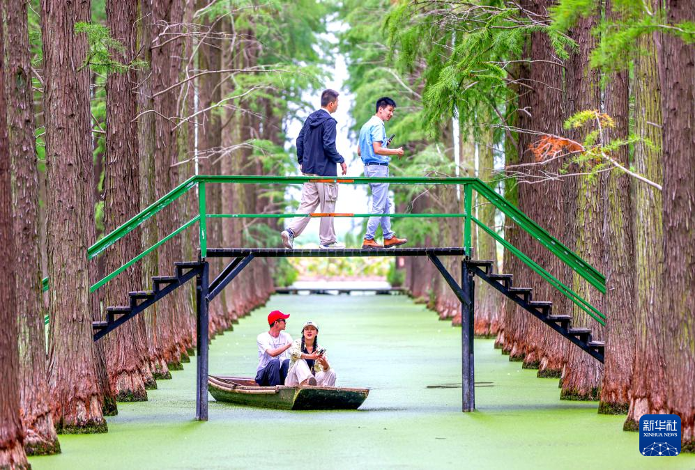 9月11日,游客在江蘇省揚州市江都區淥洋湖濕地公園“水上森林”賞景游玩。