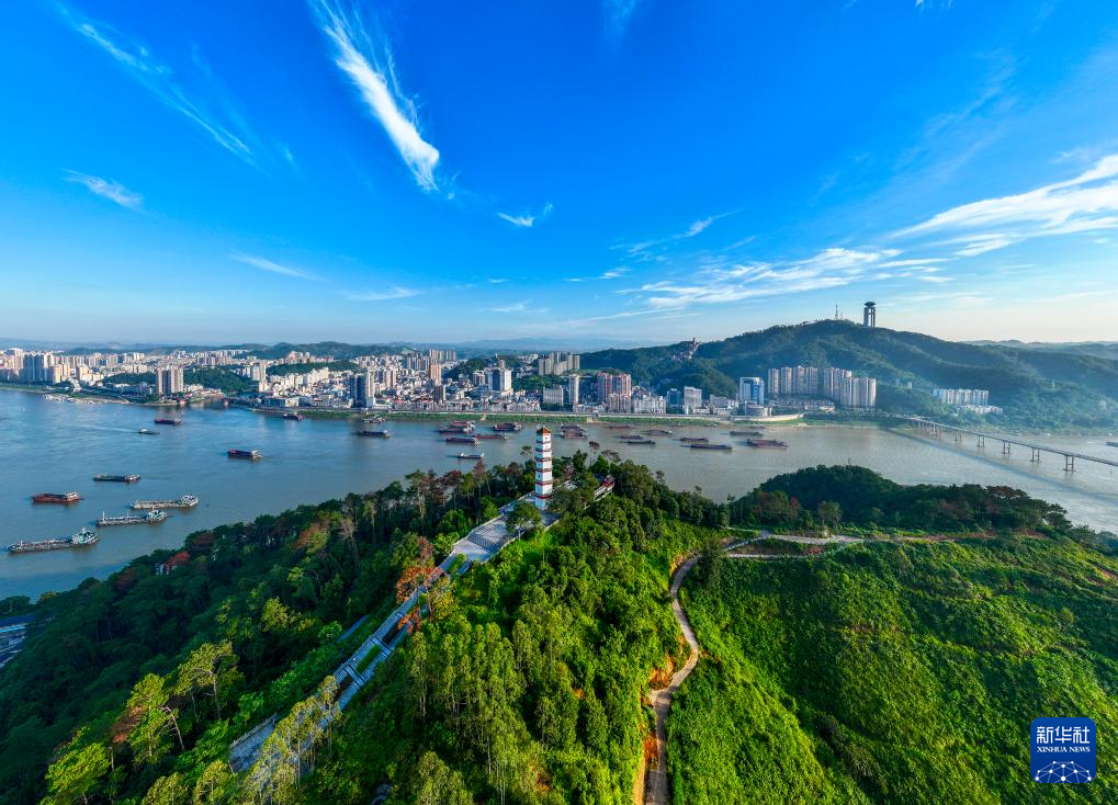 8月30日,在廣西梧州市萬秀區的西江航道上,船只在秋日晴空下往來穿梭(無人機照片)。