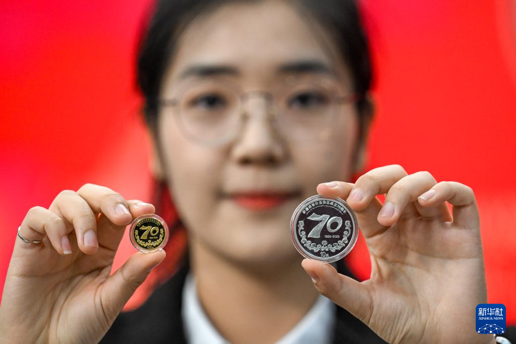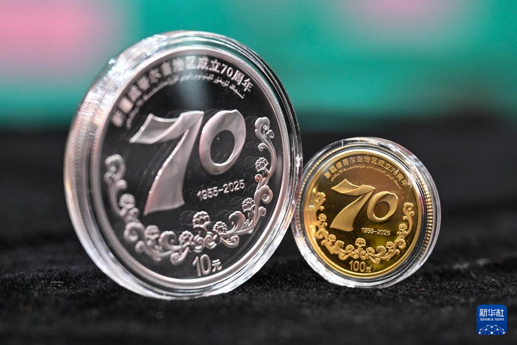 這是9月19日拍攝的新疆維吾爾自治區成立70周年金銀紀念幣。